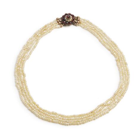 2545/1206Firradet perlehalskæde prydet med talrige flodperler og granat- og perlelås af 10-12 kt. guld. L. 41,5 cm.