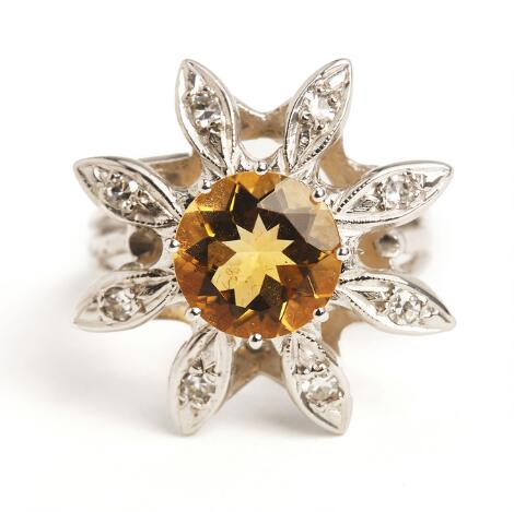 2545/1198Topasring af 18 kt. hvidguld prydet med facetlebet topas omkranset af talrige enkeltslebne diamanter. Str. 55.