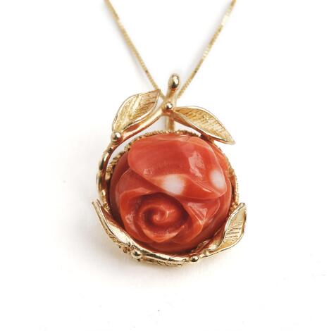 2545/1213Koralvedhæng af 14 kt. guld prydet med udskåret koral i form af en rose. Kæde af 18 kt. guld. L. 2 og 45 cm. (2)