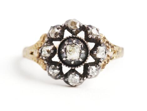 2545/1187Diamantring af 14 kt. guld og sølv prydet med talrige old-cut diamanter. Vægt ca. 3 g. B. 13,5 mm. Str. 60.