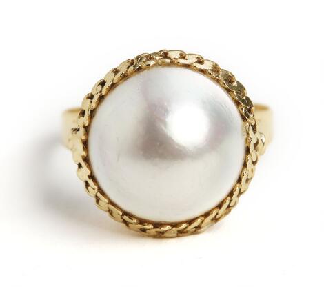 2545/1190Perlering af 9 kt. guld prydet med mabé kulturperle. Vægt ca. 4 g. B. 15 mm. Str. 55.