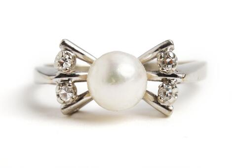 2545/1203Lund Copenhagen: Perle- og diamantring af 14 kt. hvidguld prydet med perle og diamanter. Str. 56.