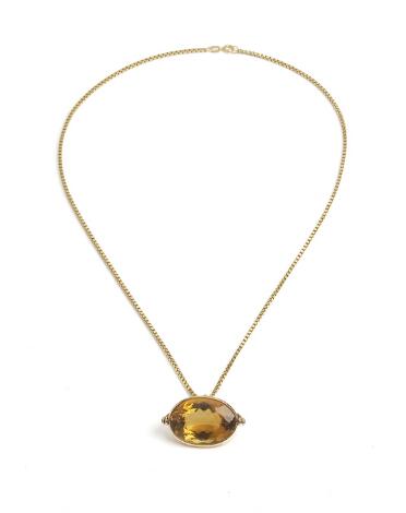 2545/1208Citrinvedhæng af 14 kt. guld prydet med citrin. Halskæde af 14 kt. guld medfølger. L. 60 cm. (2)