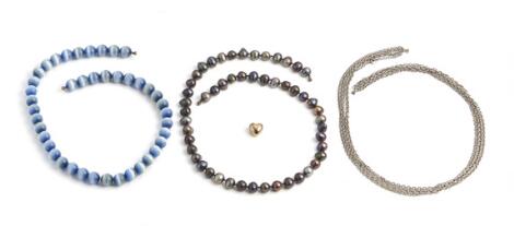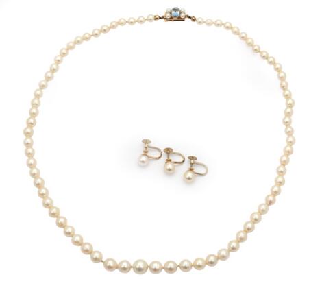 2545/1188Robert Valentin Olsen: Perlehalskæde og tre øreskruer af 14 kt. guld prydet med kulturperler. (4)