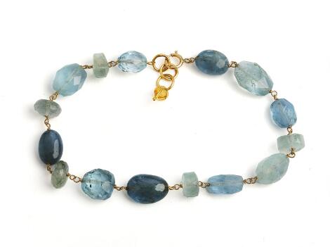 2545/1186Natascha Trolle: Aquamarinarmbånd af 18 kt. guld prydet med talrige perler af aquamarin. L. 19-20 cm.