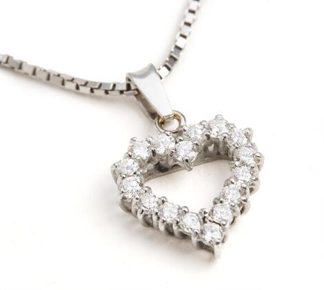 2545/1210Diamantvedhæng af 18 kt. hvidguld prydet med talrige brillantslebne diamanter. Samt kæde af 14 kt. hvidguld. (2)