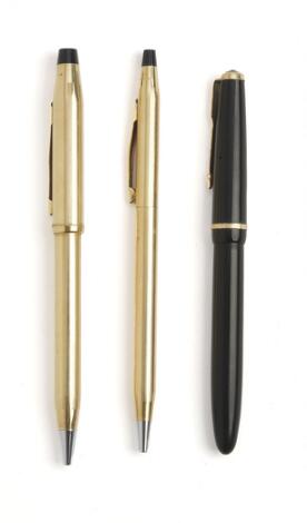 2545/1234Parker, Cross: En "Slimfold" fyldepen ad sort resin med spids af 14 kt gulf. Samt to kuglepenne af forgyldt metal. L. 12,5-13,7 cm. (3)