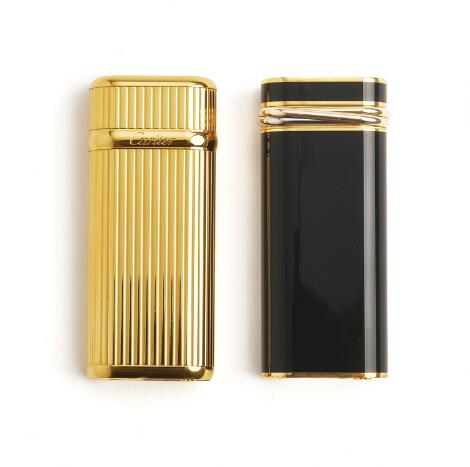 2545/1226Cartier: En "Trinity" og en "Must de Cartier" lighter af henholdsvis forgyldt metal og sort lak. H. 5 og 5,8 cm. (2)