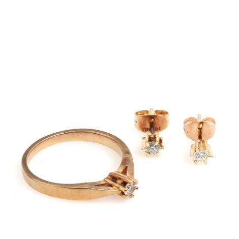 2545/1180Toftegaard: Diamantring- og ørestikker af 14 kt. guld hver prydet med diamant. Str. 56. (3)