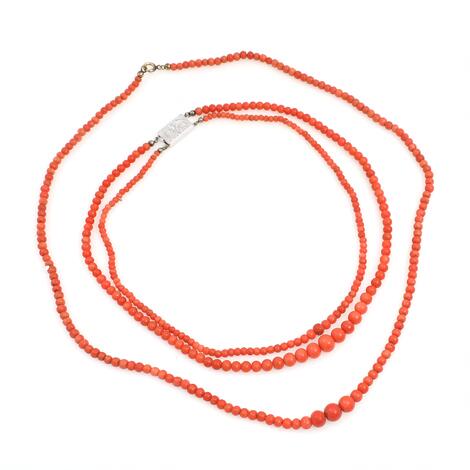 2545/1181To koralhalskæder hver prydet med talrige polerede koralperler. L. 40-60 cm. (2)