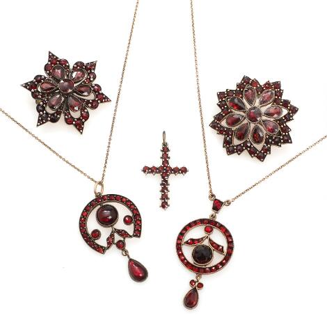 2545/1178Granatsmykkesæt af forgyldt metal bestående af to halskæder, to brocher og et vedhæng. (5)