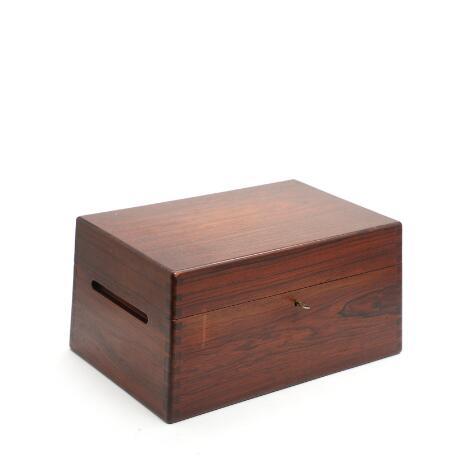 2545/729Dansk design: Skrin af massiv palisander med koniske sider, indeholdende fire karafler og seks glas. Udført hos Søren Willadsen. H. 20,5. L. 40. D. 27.