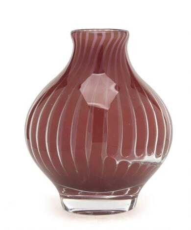 2545/905Orrefors: Vase af klart glas med rødlilla underfang ilagt luftbobler i vertikale striber. H. 18,5. Diam. ca. 14.