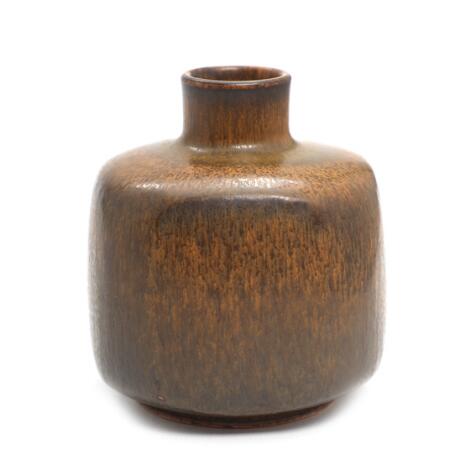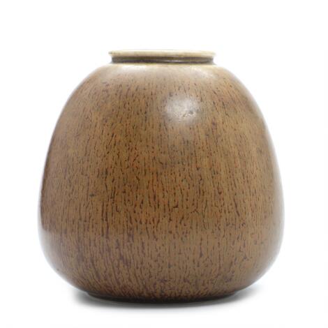 2545/890Saxbo: Rund vase af stentøj dekoreret med brun harepelsglasur. Saxbo, 14. 1950–1968. H. 16,5 cm.