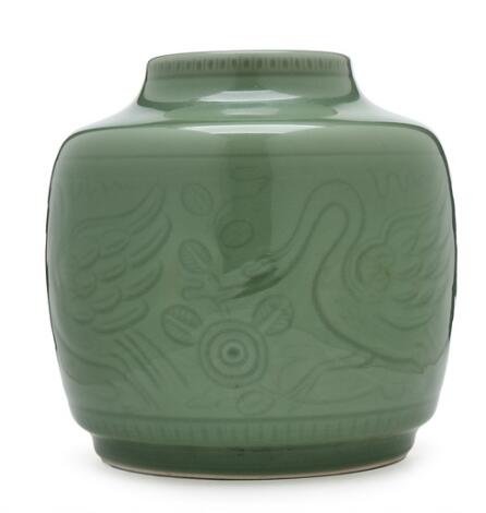 2545/519Georg Thylstrup: Rund vase af stentøj med indridsede motiver af svaner og plantedekor i relief. Dekoreret med celadonglasur. H. 17.