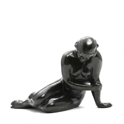 2545/871Gunnar Lindhardt Hansen: Siddende nøgen kvinde. Signeret GLH. Grønpatineret metal. H. 17 cm.