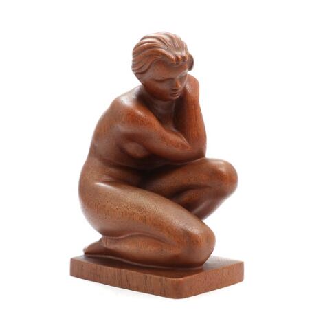 2545/772Harald Isenstein: Skulptur af udskåret teak i form af knælende kvinde. Sign. Isenstein, Udf: Vonsild. H. 23.