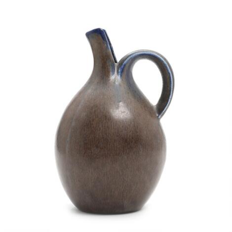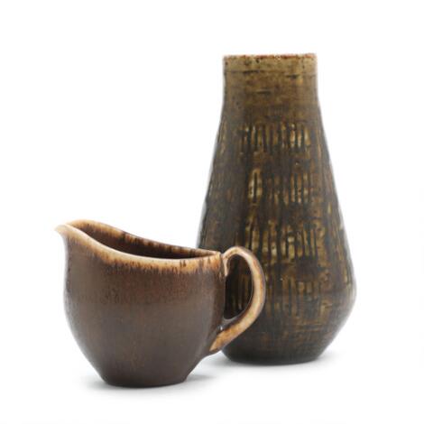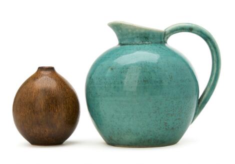2545/501Eva Stæhr-Nielsen: Kande og vase af stentøj, dekoreret med hhv. turkisgrøn og brun glasur. (2)