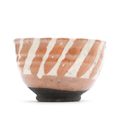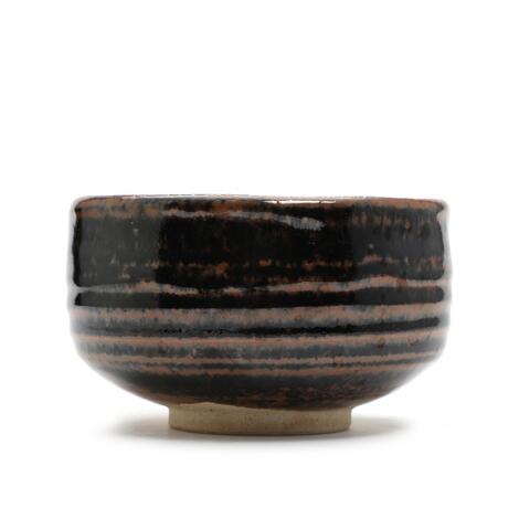 2545/927Japansk keramiker: Chawan teskål af stentøj med let oval form. Dekoreret med hvide bånd. 1960-70'erne. H. 9 cm.