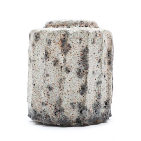 2545/863Hans Vangsø: Let oval krukke af stentøj, modelleret med vertikal reliefdekor. Unik. H. 11. B. 10.