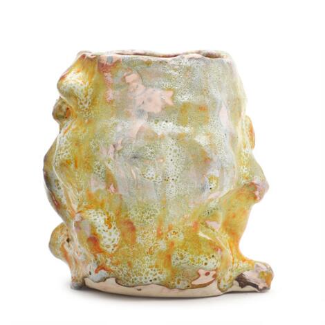 2545/578Bente Christensen: Organisk vase af stentøj. Dekoreret med gul glasur med rødorange elementer. Sign. H. 17 cm.