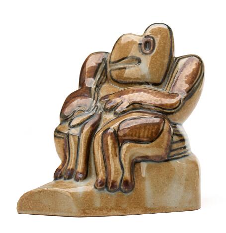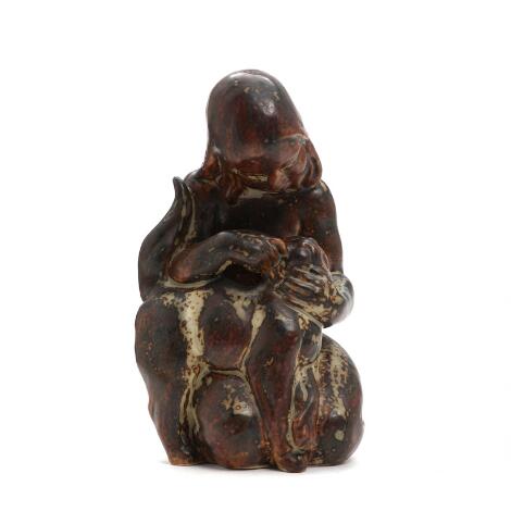 2545/690Sten Lykke Madsen: Figur af stentøj dekoreret med brun og transparent grå glasur. H. 14,5.