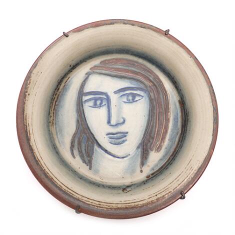 2545/742Jais Nielsen: Bordskål af stentøj, dekoreret i brun og blå glasur med portræt. Kgl. P. Sign. monogram. H. 7. Diam. 32.