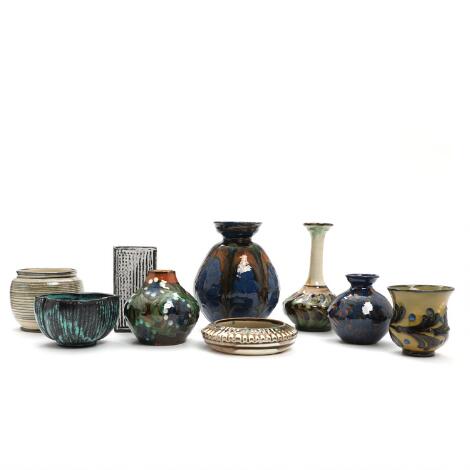 2545/908Nils Kähler, m.fl.: Ni dele lertøj, dekoreret med polykrome glasurer, bestående af to otte vaser og en skål. Sign. HAK. Kähler. H. 3,5-16. (9)