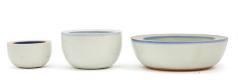2545/688Richard Manz: Tre skåle af porcelæn, delvis dekoreret med hhv. gråhvid og blå glasurer, delvis uglaserede. (3)