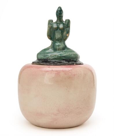 2545/543Jais Nielsen: Cirkulær lågskål af lertøj dekoreret med lyserød, grøn og sort glasur. Udført hos Kähler. Unik. H. 16,8.