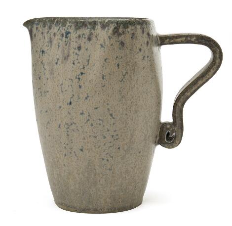 2545/706Arne Bang: Kande af stentøj, modelleret i tresidet form. Dekoreret med grå glasur med grønne og blå elementer. H. 13,5.