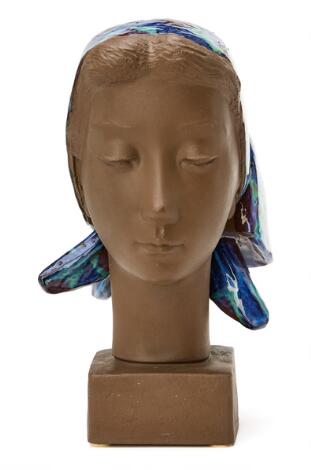 2545/709Johannes Hedegaard: Buste af terrakotta i form af kvinde med hovedtørklæde. H. 34.