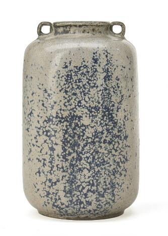 2545/686Arne Bang: Firsidet vase af stentøj, modelleret med to små gennembrudte hanke. Dekoreret med grå og blå glasur. Sign. monogram. H. 15,5.