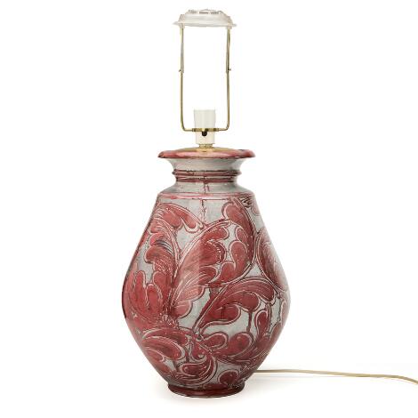 2545/534Jens Thirslund: Bordlampe af lertøj, dekoreret med bladdekor i rød lustre glasur på grå lustre bund. Udført hos Kähler. H. 43/67,5.