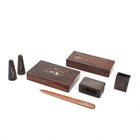 2545/779Dansk design: To lågæsker, to tændstikæsker, en brevåbner samt et salt- og pebber sæt af palisander og røget eg. 4,5-11. (7)