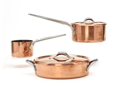 2545/552Henning Koppel: “Taverna”. Tre dele køkkentøj af kobber med hanke af rustfrit stål. Georg Jensen Design. Diam. 9–19,8. (3)