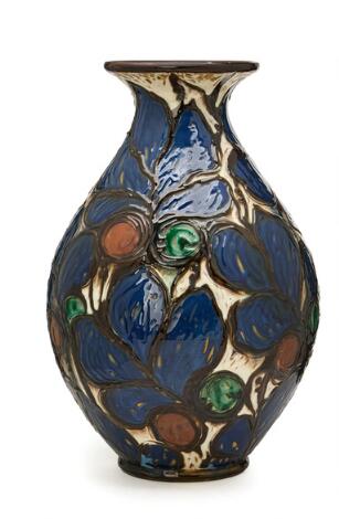 2545/531Kähler: Gulvvase af lertøj dekoreret med hornglaserede blade og bær i mørkeblåt, brunt og grønt på lys bund. H. 42,5.