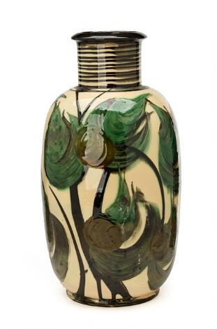 2545/525Kähler: Gulvvase af lertøj, dekoreret med hornglaseret bladdekor i grønt, brunt og sort på cremefarvet bund. H. 48,7.