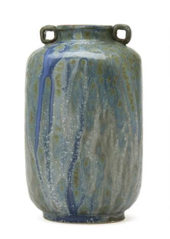 2545/546Arne Bang: Firsidet vase af stentøj modelleret med to små hanke. Dekoreret med grøn og blå glasur med grå elementer. H. 16.