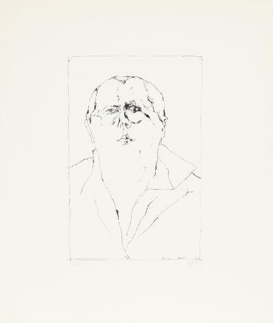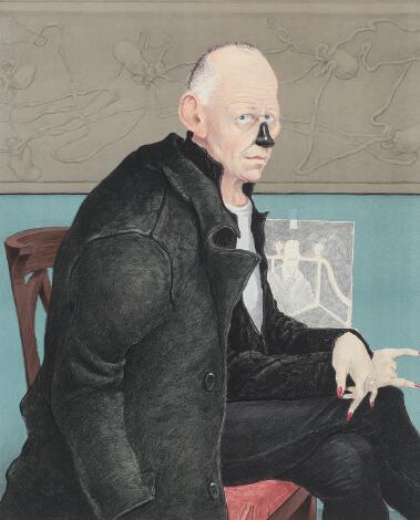 2545/684Michael Kvium: "Selvportræt som Eckersbergs Thorvaldsen", 2001. Litografi i farver. Lysmål 68 x 54.