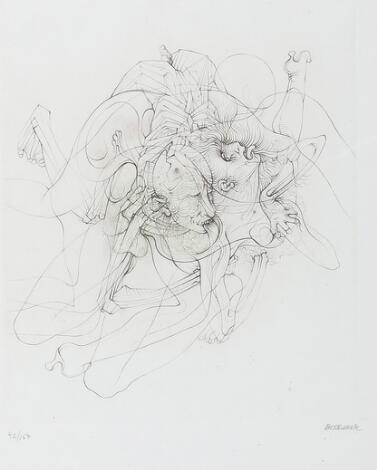 2545/733Hans Bellmer: "Dialogue entre un prètres et un Moribond", 1968. Signeret Bellmer, 42/150. Radering. 37 x 28 cm.
