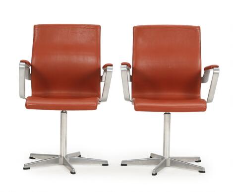2545/858Arne Jacobsen: "Oxford". A pair of swivel armchairs with aluminium base, upholstered with brown leather. Model 3271. Manufactured by Fritz Hansen, 1986. (2)
