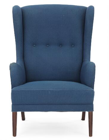 2545/939Frits Henningsen: Wing back easy chair with mahogany legs. Sides, seat and back upholstered with blue wool.