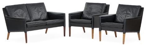 2545/936Kurt Østervig: Two seater sofa and a pair of easy chairs with rosewood legs. Upholstered with black leather. (3)