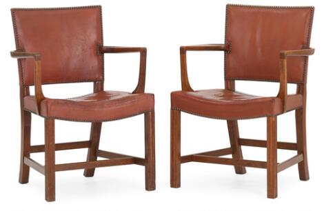 2545/989Kaare Klint: “The Red Chair”. A pair of oak armchairs. Seat and back upholstered with redbrown leather. (2)
