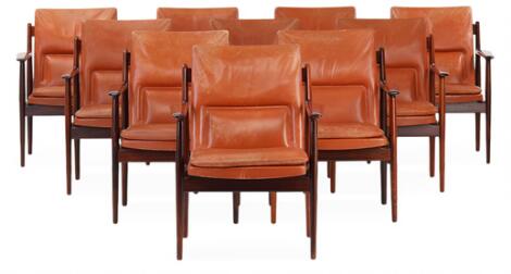 2545/959Arne Vodder: Ten rosewood armchairs. Upholstered with brown, coloured leather. (10)