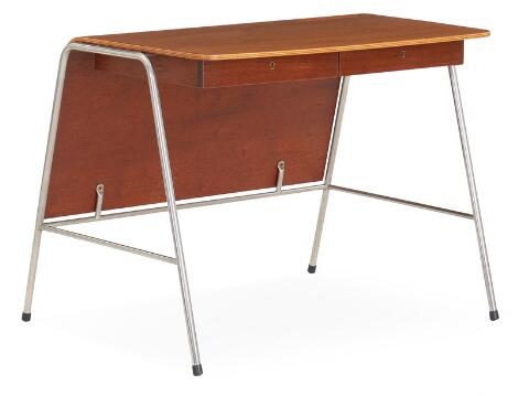 2545/977Arne Jacobsen: “Munkegaard”. Rare teacher's desk with mat chromed steel frame. Top and back of laminated teak.