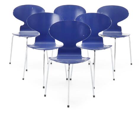 2545/951Arne Jacobsen: "Ant Chair". Set of six chairs with steel legs. Blue lacquered wood seat and back. (6)