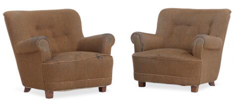 2545/950Danish cabinetmaker: A pair of easy chairs with stained beech legs. Upholstered with brown wool. (2)