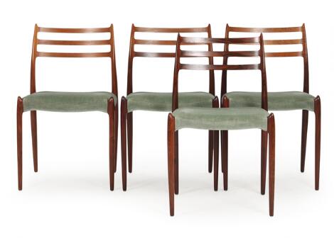 2545/956Niels O. Møller: Four rosewood chairs, upholstered in seats with blue/green fabric. Model 78. Manufactured by J. L. Møller. (4)